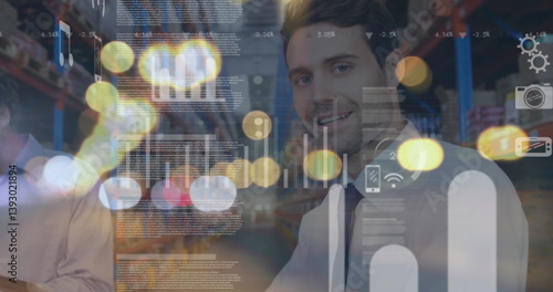 Image of data processing over businessman using tablet in warehouse shipping centre