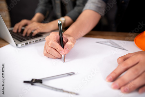 Image of engineer meeting for architectural project. working with partner and engineering tools on workplace vintage tone.