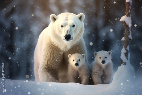 Image of family of polar bears is in the middle of a snowstorm in the forest. Mammals. Wildlife Animals. Ai.