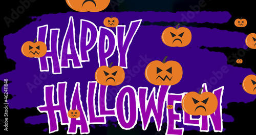 Image of halloween greetings and pumpkins moving over purple background with trees