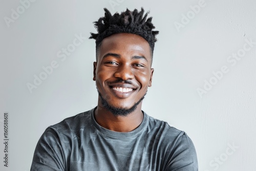 Image of handsome smiling young african man standing isolated over white background. Looking camera.