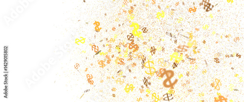 Image of many dollar signs falling on white background. Perfect for finance, money, or wealth concepts.