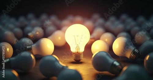 Image of multiple unlit light bulbs surrounding a glowing one, suitable for creative ideas theme visuals.