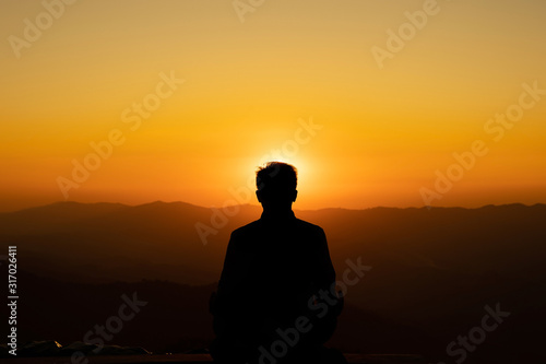 Image of Silhouette meditation yoga practicioner during sunset on highest mountain.