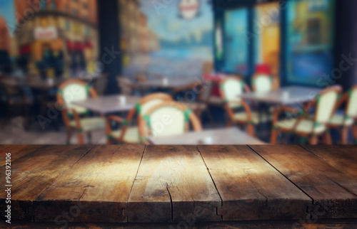 image of wooden table in front of abstract blurred background of restaurant lights