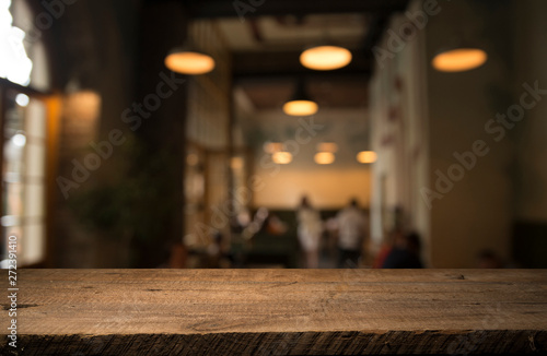 image of wooden table in front of abstract blurred background of resturant lights