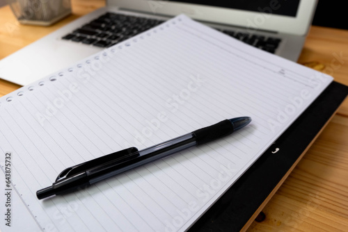 Image of workplace in office room without people with open laptop, pencil and notebook lying on wooden desk