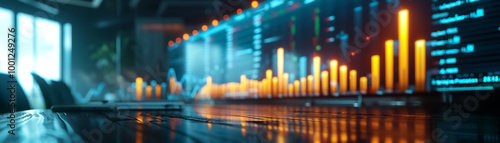 image showcases modern workspace with focus on data visualization, featuring glowing bar graphs and digital displays that suggest business growth and strategy