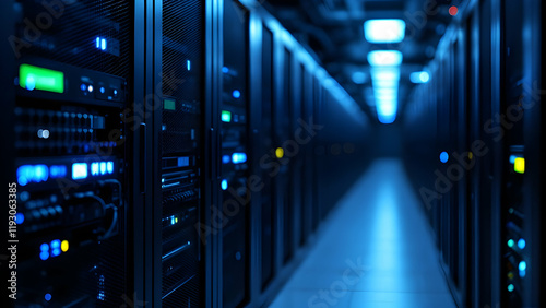 Image shows a long corridor of dark server racks in a data center. Blue lights illuminate the equipment and the floor, creating a dramatic, futuristic feel. The servers are closely packed together.