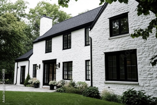 Imagine a delightful white cottage nestled amidst vibrant, lush greenery, creating a picturesque scene in a peaceful residential neighborhood during a tranquil afternoon