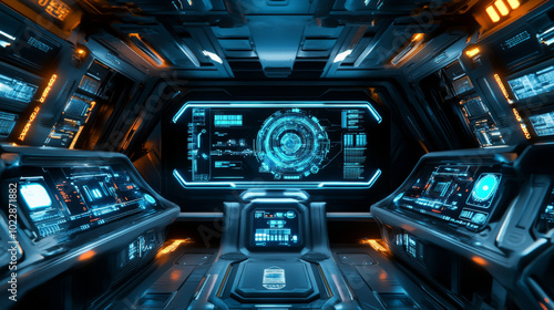 Imagine a sci-fi futuristic HUD (Heads-Up Display), designed to resemble a cutting-edge virtual reality technology screen.