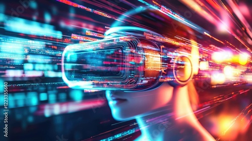 Immersive Virtual Reality Experience with Futuristic Visuals and Vibrant Light Trails in Abstract Digital Space