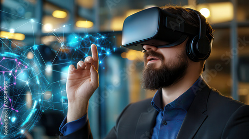Immersive virtual reality experience with man using VR headset, interacting with digital elements. scene showcases advanced technology and innovation in modern environment
