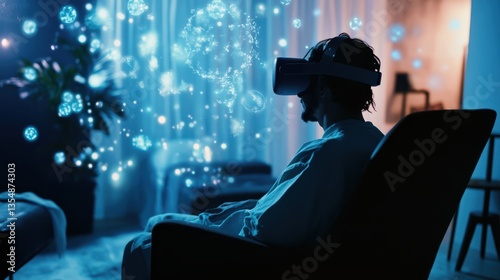 Immersive VR Experience Man in Virtual Reality Metaverse with Glowing Particles