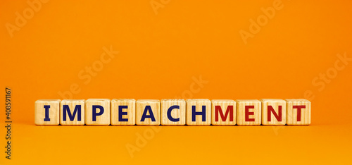 Impeachment symbol. Wooden cubes with the word 'impeachment'. Beautiful orange background, copy space. Business, impeachment concept.