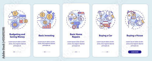 Important knowledges onboarding mobile app screen. Life skills walkthrough 5 steps editable graphic instructions with linear concepts. UI, UX, GUI template. Myriad Pro-Bold, Regular fonts used