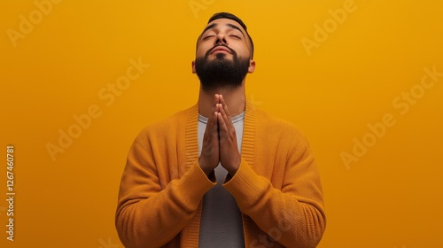 In a cozy indoor space, a Muslim man prays with deep focus and reverence, hands clasped together as he seeks connection and peace. The bright yellow wall enhances the atmosphere of tranquility