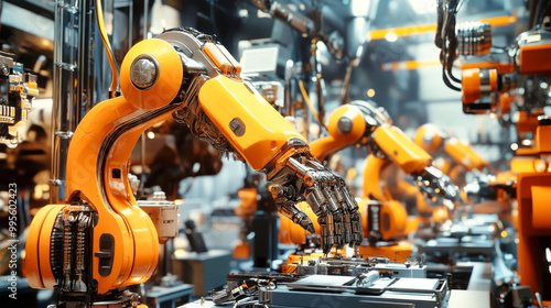 In a dynamic factory space, advanced robotic arms work in unison to assemble and manufacture sophisticated products, showcasing innovative technology and design