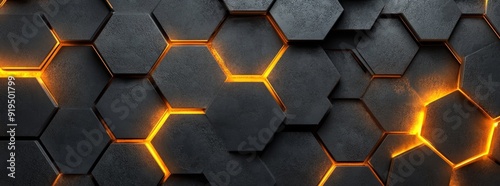 In a futuristic style, lush digital geometric technology hexagon background banner illustration 3D, bright gold, brown, gray and black hexagonal shape texture wall (Stock)