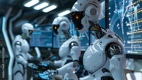 In a laboratory environment, a cybernetic robot researches materials, predicting their possible application in future technologies and science.
