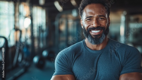 In a lively gym setting, a bearded man wearing athletic attire smiles broadly with arms crossed, projecting a positive image full of vigor and confidence.