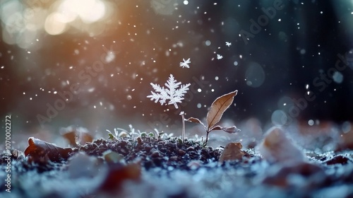 In a serene winter landscape, a delicate snowflake gently descends onto a lone leaf, surrounded by softly falling snow. The background is blurred, evo