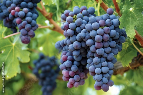 In a sun-drenched vineyard, vibrant clusters of ripe grapes hang from the vines, promising the rich flavors of summer's bounty captured in each plump fruit