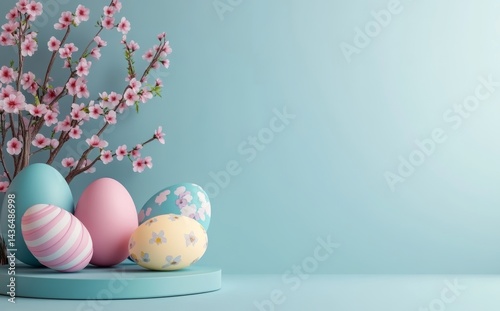 In a tranquil pastel green setting, a white pedestal stands adorned with pink Easter eggs and surrounded by blooming cherry blossoms, as gentle petals float softly to the ground