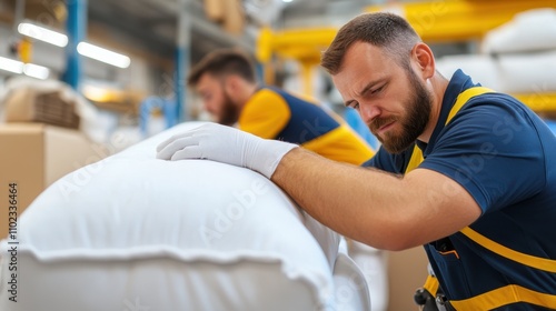 In a vibrant factory setting, a dedicated worker puts final touches on fluffy pillows, showcasing precision and dedication as part of efficient production routines.