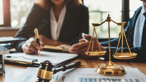 In a vibrant legal office, professionals engage in meaningful discussions, crafting strategies while surrounded by legal symbols and documents reflecting their commitment to justice.