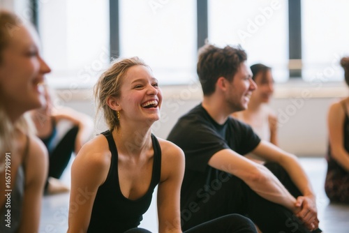 In a well-lit studio, dancers share moments of joy as they stretch and laugh together on the floor. The atmosphere is lively, reflecting their camaraderie and dedication to dance