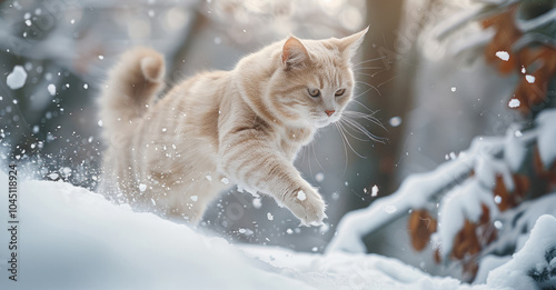 In a winter forest, a white cat jumps through fresh snow.