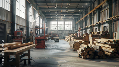 In an industrial carpentry shop, logs are cut with precision using high-powered saws. Skilled craftsmen shape timber into functional structures and polished furniture.