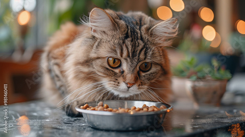 In an opulent setting, a silver dish filled with premium cat food sits elegantly on a polished marble countertop.