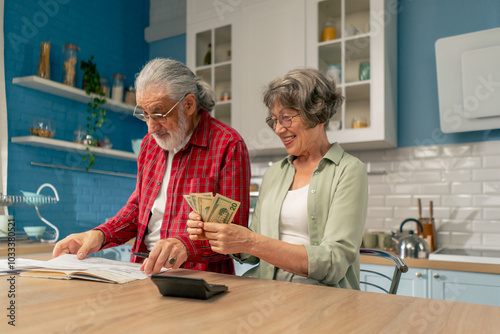 in bright kitchen an elderly cute couple at the table count their expenses monthly payment summing up the results of the year utilities count monthly survival count money