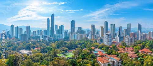In bright sunlight, futuristic city architecture with vegetated buildings and high-rise structures