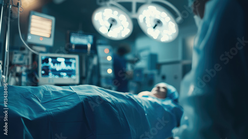 In the blurred background of an operating room, medical equipment is visible on one side and some lights are visible in the distance