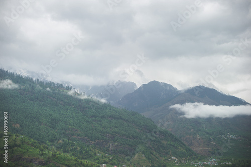 In the front Vashisht village at the Kullu valley on background Himalaya mountains and gray sky with clouds