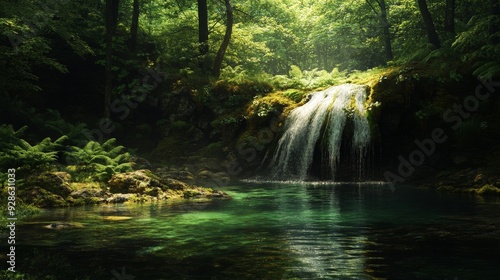 In the heart of the forest, a waterfall pours its crystal-clear waters into a serene pool, surrounded by ferns and moss.