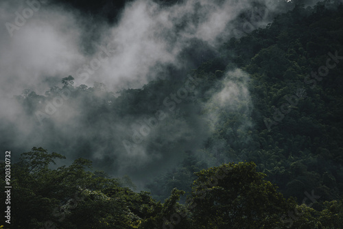 In the morning, the mountain landscape is shrouded in mist and fog, with clouds drifting across the sky, creating a stunning natural background that enhances the forest's beauty.