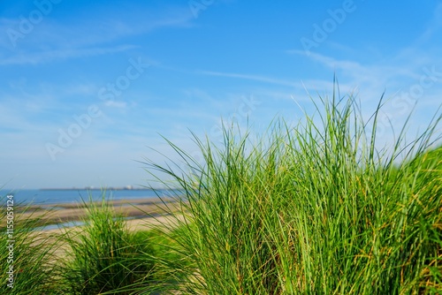 In the Netherlands, a green grass field stretches across the foreground under a clear blue sky with a few white clouds. The low-angle shot emphasizes the grass s height and serenity.