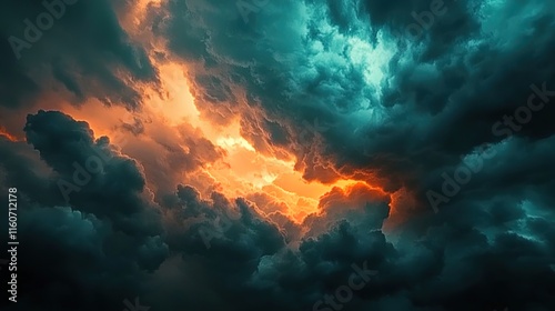 In the sky, dark clouds and light stormy thunder, colorful clouds in sunset colors