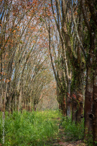 In the summer, the leaves in rubber trees will start to change from green to orange, which is the time to stop tapping rubber, in Pathio District, Chumphon