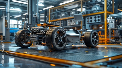 In this concept, an Authentic Electric Car Platform Chassis Prototype is standing on a hybrid axel frame, which includes wheels, suspension, engine, brakes, and battery.