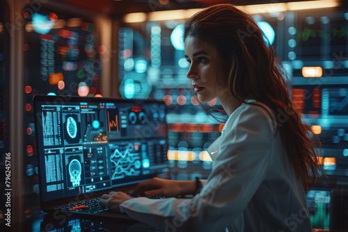 In this technologically advanced setting, a scientist examines detailed brain images, showcasing medical innovation