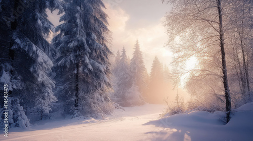 In winter, snow covered cedar trees are piled up with snow