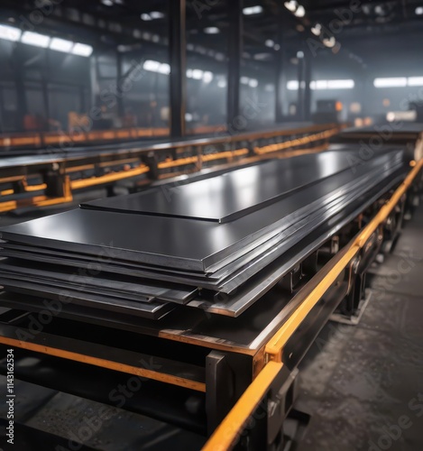 Incandescent steel sheets transported on conveyor system, factory, factory floor, machinery