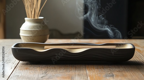 Incense sticks smoldering in a dark, wavy ceramic holder on a wooden surface, with a vase of dried plants in the background.