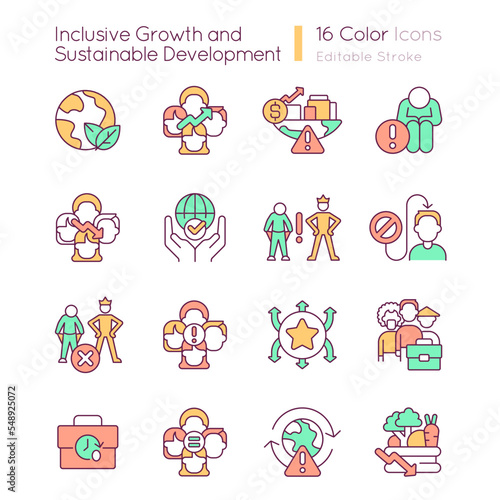 Inclusive growth and sustainable development RGB color icons set. Social equality. Isolated vector illustrations. Simple filled line drawings collection. Editable stroke. Quicksand-Light font used