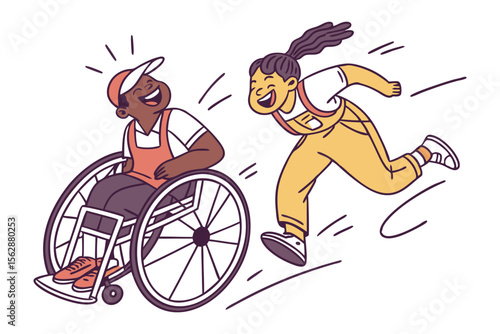 Inclusive Joy: Two children share a moment of unbridled happiness, one seated in a wheelchair and the other sprinting beside, highlighting the beauty of friendship and inclusivity.